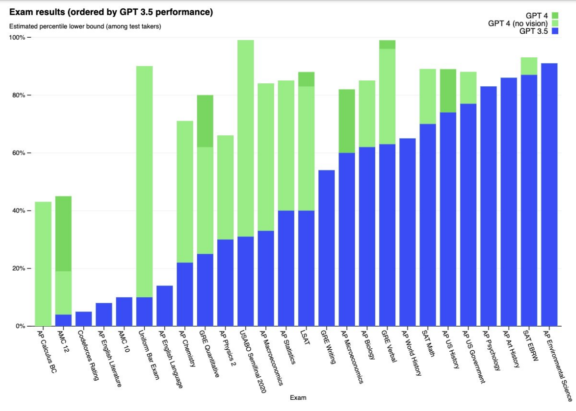 Рисунок 1: Взято непосредственно из технического отчета GPT-4 (OpenAI, 2023b). Чтобы получить представление о том, насколько быстро прогрессируют возможности модели, обратите внимание на скачок в результатах экзаменов между GPT-3.5 и GPT-4 (OpenAI, 2023b).