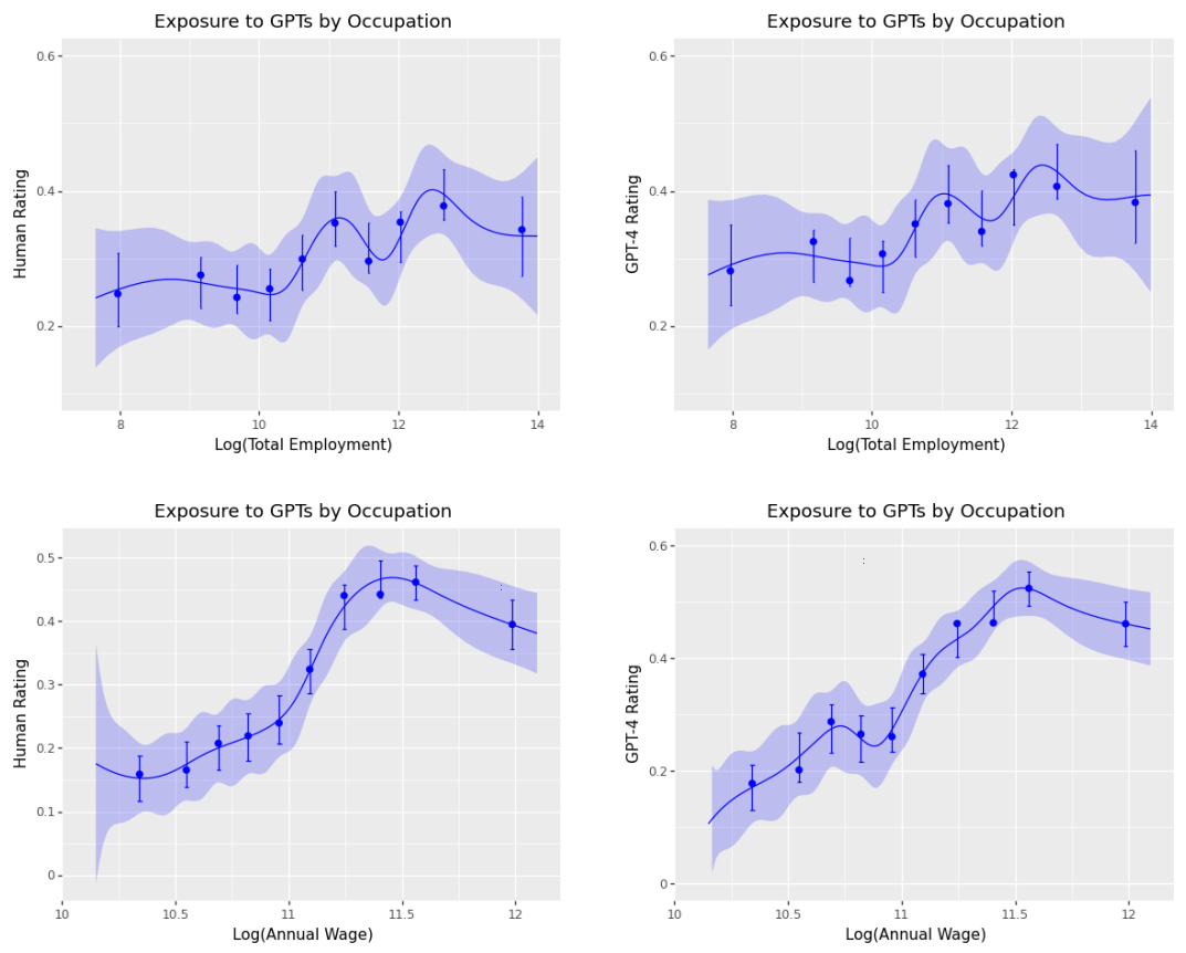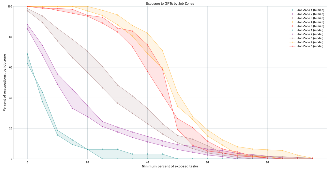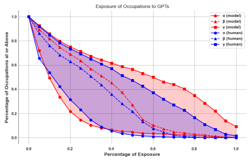 Чтобы создать наш основной набор данных о воздействии, мы собрали как аннотации людей, так и классификации GPT-4, используя промпт, настроенный на согласованность с выборкой меток от авторов. Мы наблюдаем аналогичную согласованность уровней в ответах GPT-4 и между оценками человека и машины при агрегировании до уровня задачи. Эта мера воздействия отражает оценку технической возможности сделать человеческий труд более эффективным; однако социальные, экономические, нормативные и другие детерминанты подразумевают, что техническая осуществимость не гарантирует производительности труда или результатов автоматизации. Наш анализ показывает, что примерно 19% рабочих мест имеют по крайней мере 50% задач, подверженных воздействию, если рассматривать как текущие возможности модели, так и ожидаемые инструменты, созданные на ее основе. Оценки людей показывают, что только у 3% работников в США более половины задач подвержены воздействию LLM, если рассматривать существующие возможности языка и кода без дополнительного программного обеспечения или модальностей. С учетом других генеративных моделей и дополнительных технологий, по нашим оценкам, до 49% работников могут иметь половину или более своих задач, подверженных воздействию LLM.