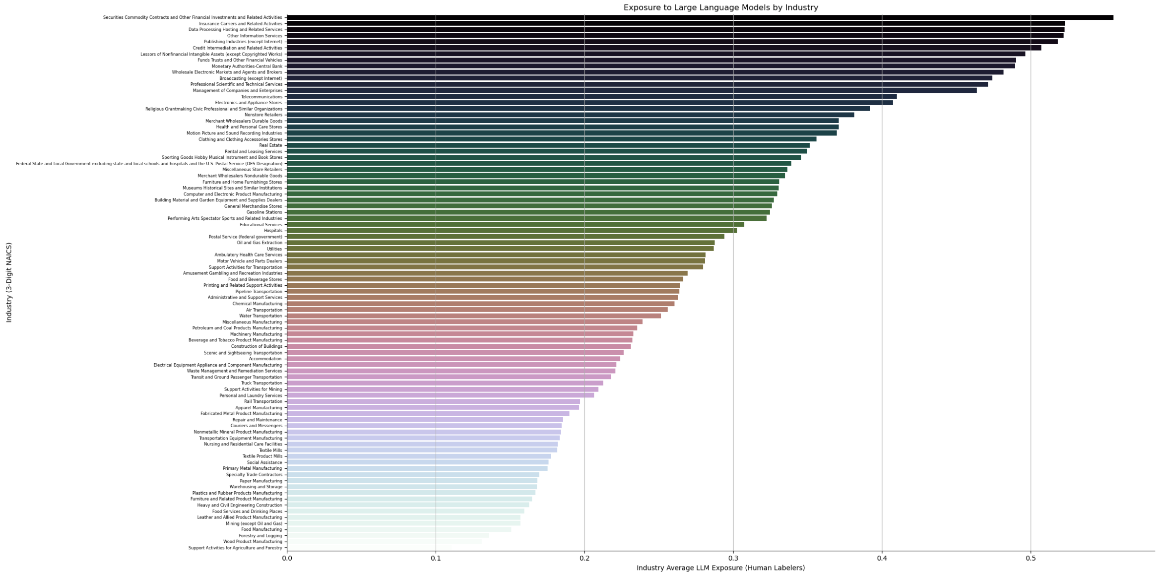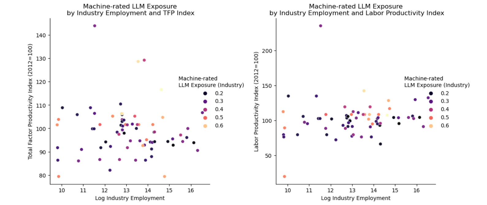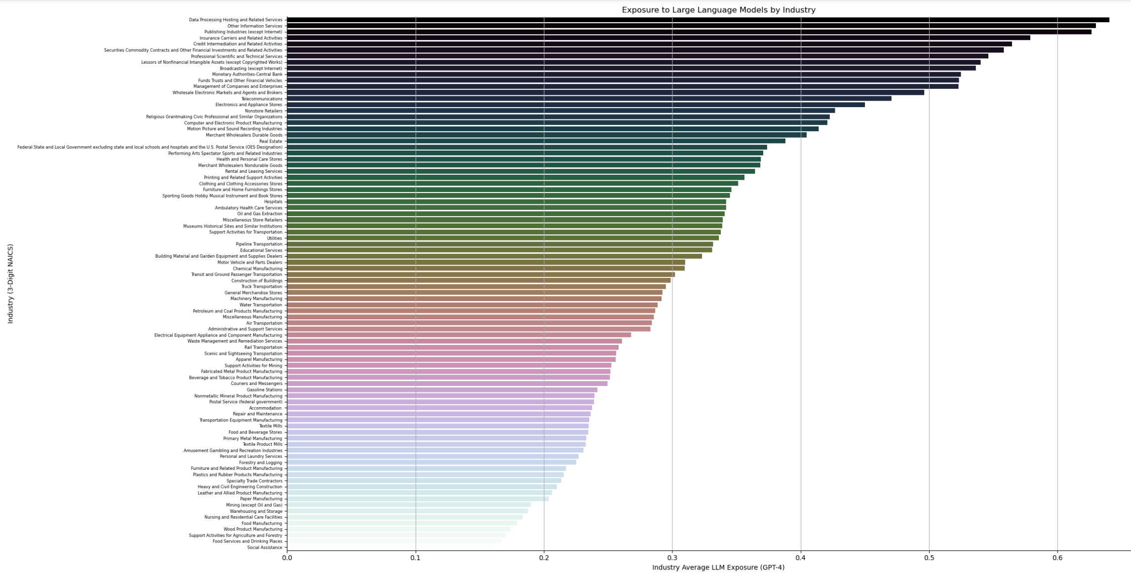 Мы анализируем воздействие по отраслям и обнаруживаем, что отрасли, связанные с обработкой информации (4-значный NAICS), демонстрируют высокий уровень воздействия, в то время как обрабатывающая промышленность, сельское хозяйство и горнодобывающая промышленность демонстрируют более низкий уровень воздействия. Связь между ростом производительности за последнее десятилетие и общим воздействием LLM представляется слабой, что предполагает потенциально оптимистичный случай, когда будущий рост производительности от LLM может не усугубить возможные последствия «болезни издержек» (Baumol, 2012; Aghion et al., 2018).3