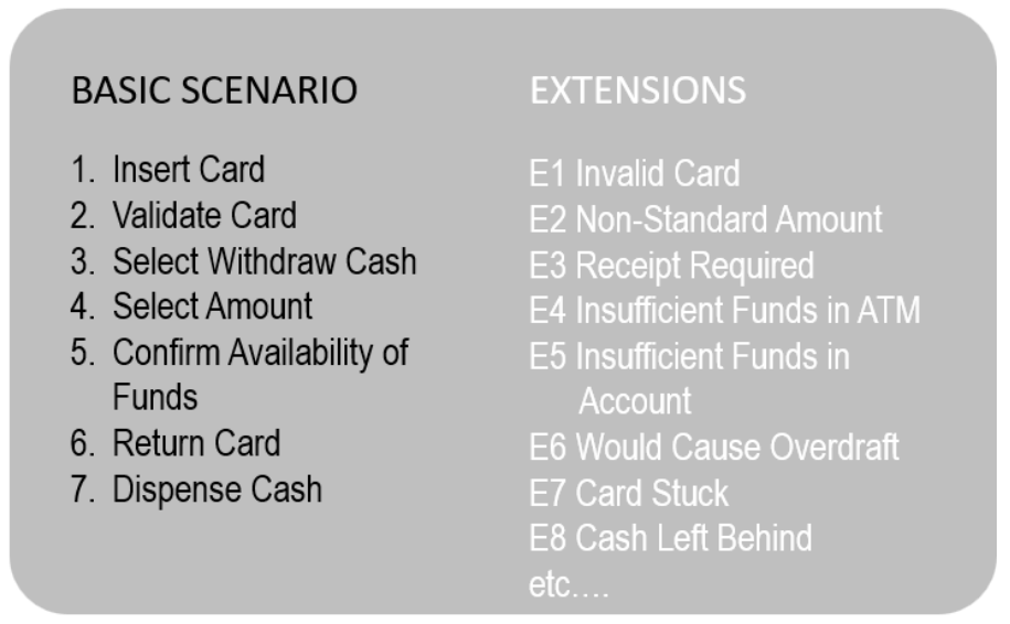 - Представлены в виде набора сценариев, которые описывают, как действующее лицо использует систему для достижения цели, и что система делает для действующего лица, чтобы помочь достичь этой цели.