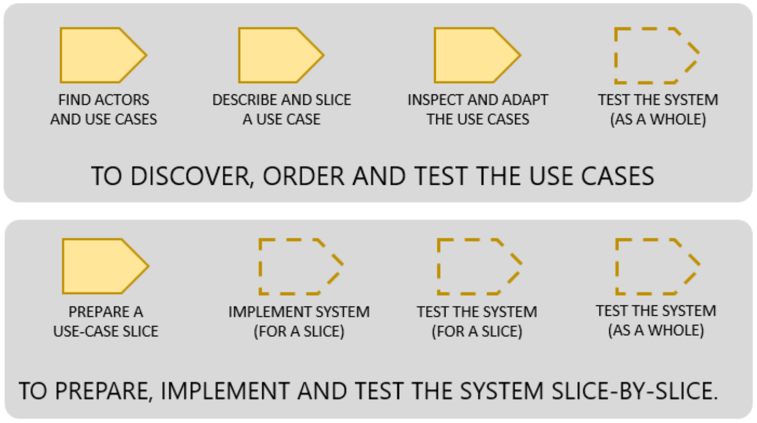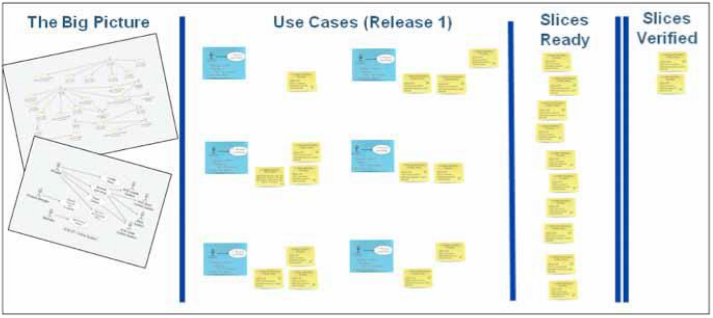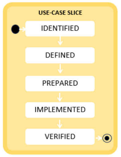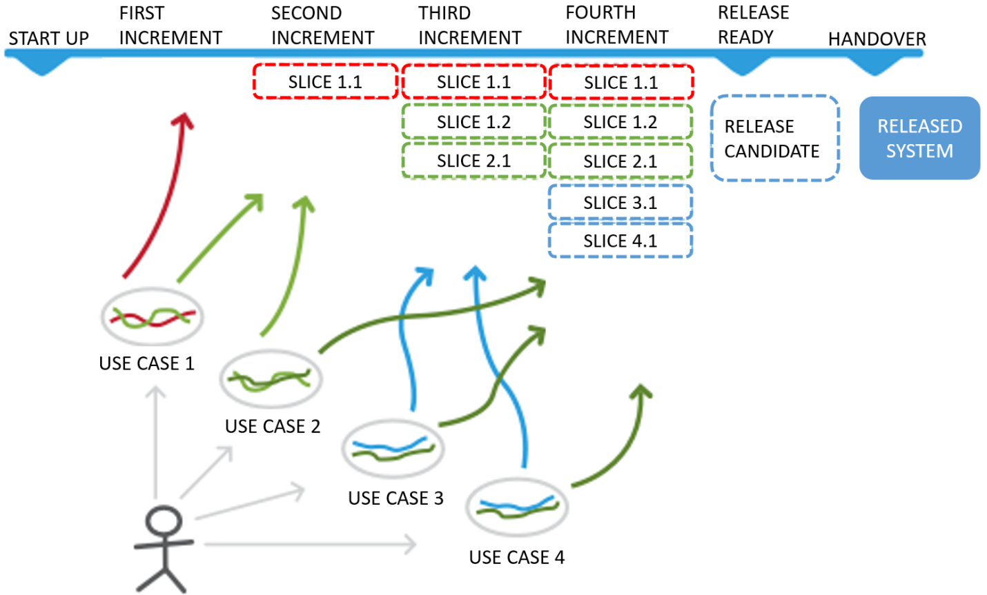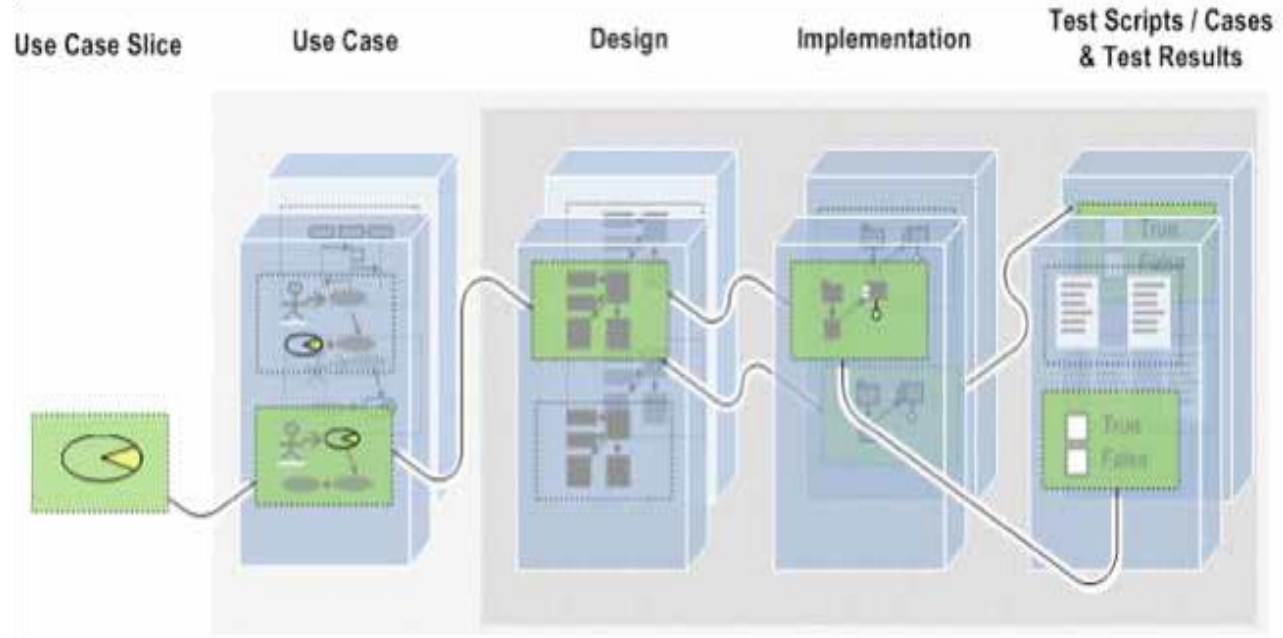 Срез юзкейса: Срез юзкейса, который предоставляет явную ценность заинтересованным сторонам разработки. Он включает срез требований, определяющий взаимодействие с его действующим лицом(ами) и действия, выполняемые юзкейсом, а также срез тестирования, проверяющий требования. Срезы юзкейсов используются для поэтапной реализации юзкейса.