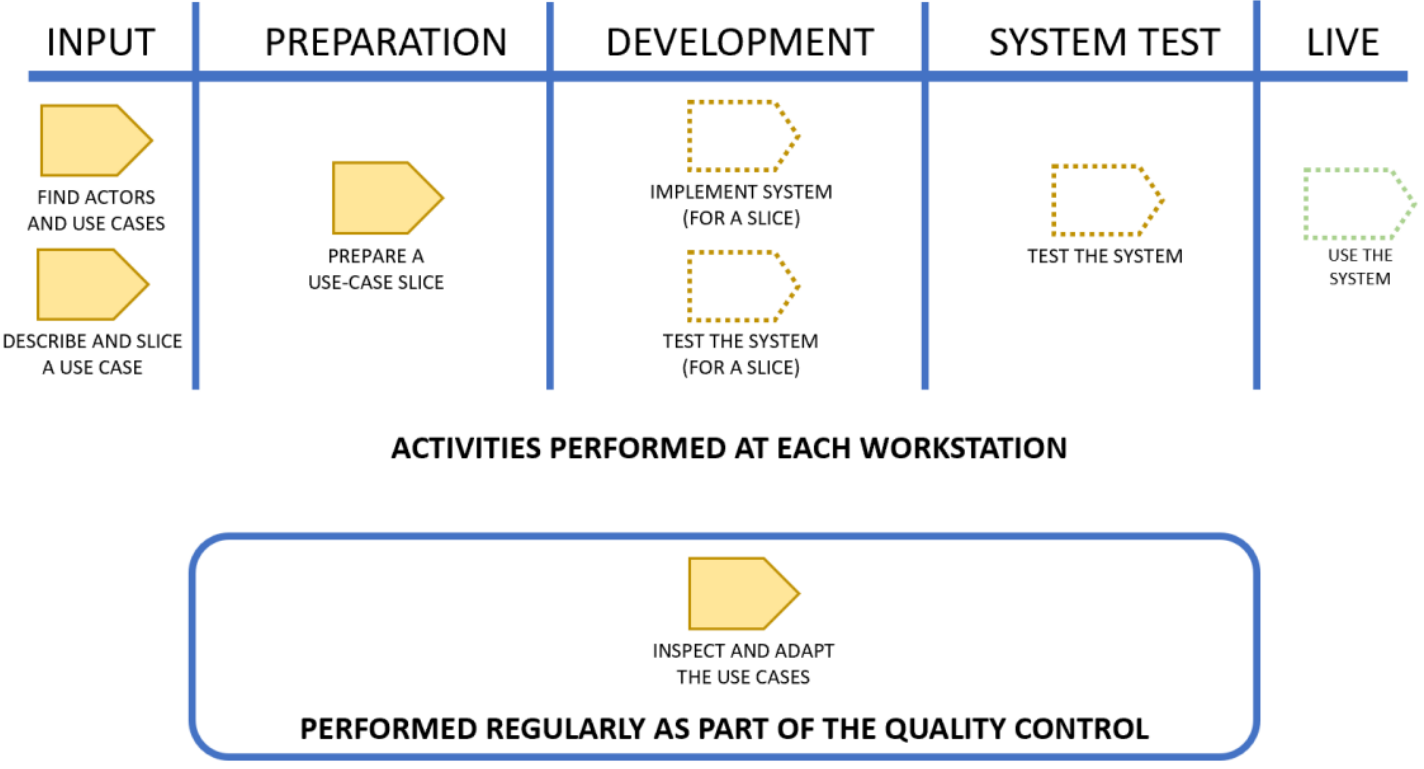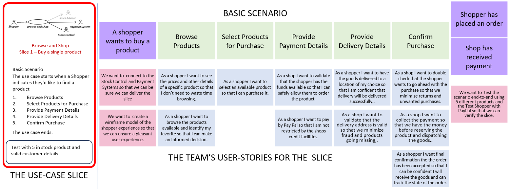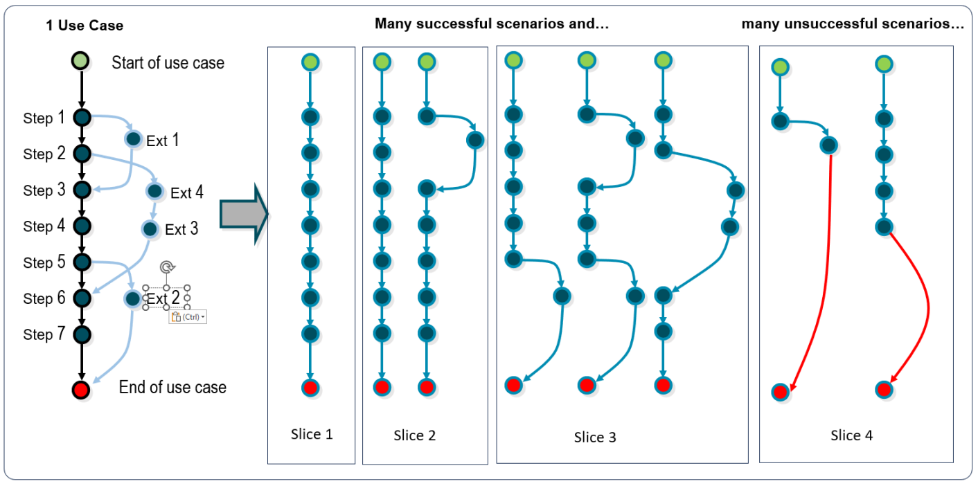Срез юзкейса: Срез юзкейса, который предоставляет явную ценность заинтересованным сторонам разработки. Он включает срез требований, определяющий взаимодействие с его действующим лицом(ами) и действия, выполняемые юзкейсом, а также срез тестирования, проверяющий требования. Срезы юзкейсов используются для поэтапной реализации юзкейса.