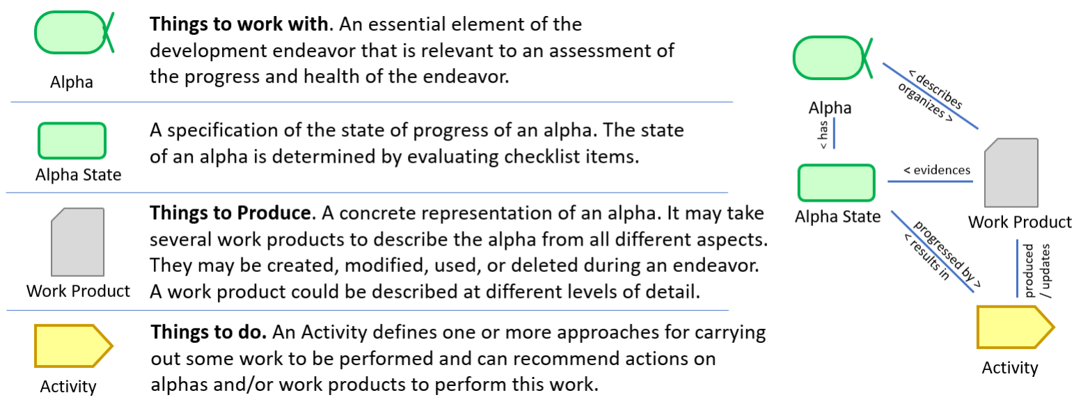 Стандарт, определяющий элементы и языковую нотацию, используемые для описания ядра Essence Alpha и любой практики или метода, использующих язык Essence.