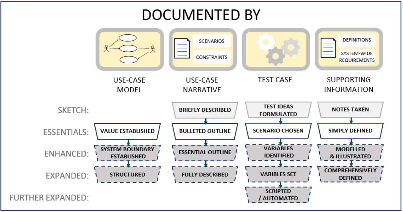 Повествования юзкейсов могут разрабатываться на разных уровнях детализации, начиная от маркированного списка, определяющего базовый сценарий и наиболее важные расширения, и заканчивая исчерпывающей, высокодетализированной спецификацией, которая определяет все действия, входные и выходные данные, задействованные в выполнении юзкейса. Повествования юзкейсов можно подготовить на следующих уровнях детализации: